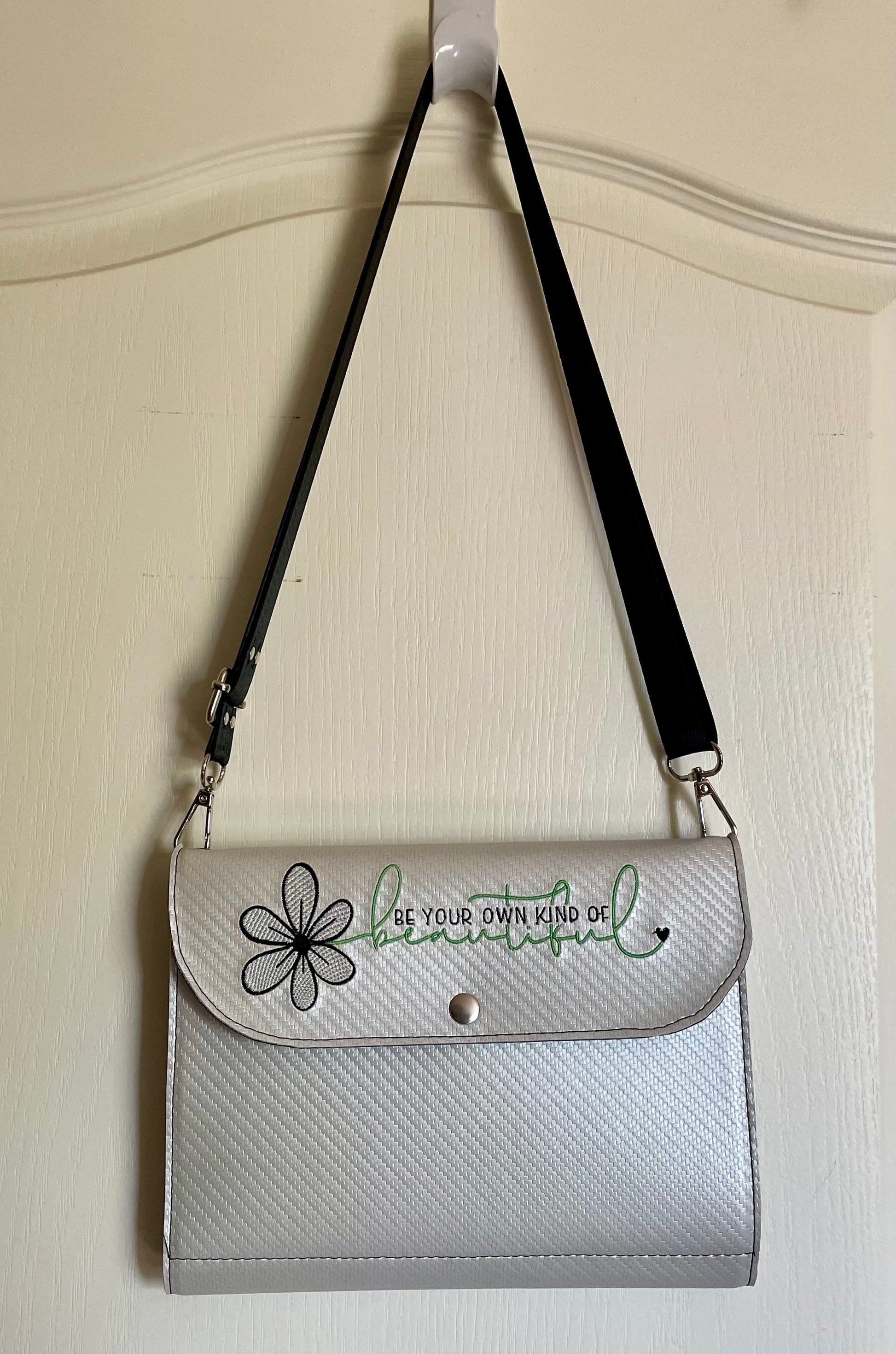 Our handcrafted vinyl notepad purses are embroidered with inspirational, funny, and nostalgic themes that are sure to be appreciated by family and friends. The notepad purses are sold with a notepad and inspiring pen of customers’ choice.(Sewing machine and embroidery machine is used to make these products). Sold to promote positivity and encourage confidence.